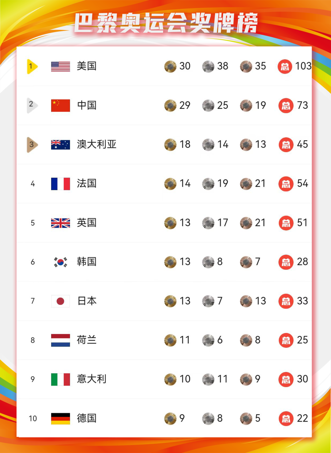 截至巴黎奥运会第13个比赛日,中国代表团共获得29金25银19铜,暂列金牌榜第二。