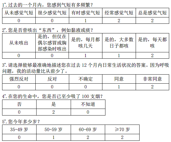 您是属于慢阻肺的高危人群,以下是一份有关您最近呼吸状况和活动能力的问卷,请您回答问卷时选择最能描述您实际情况的答案。