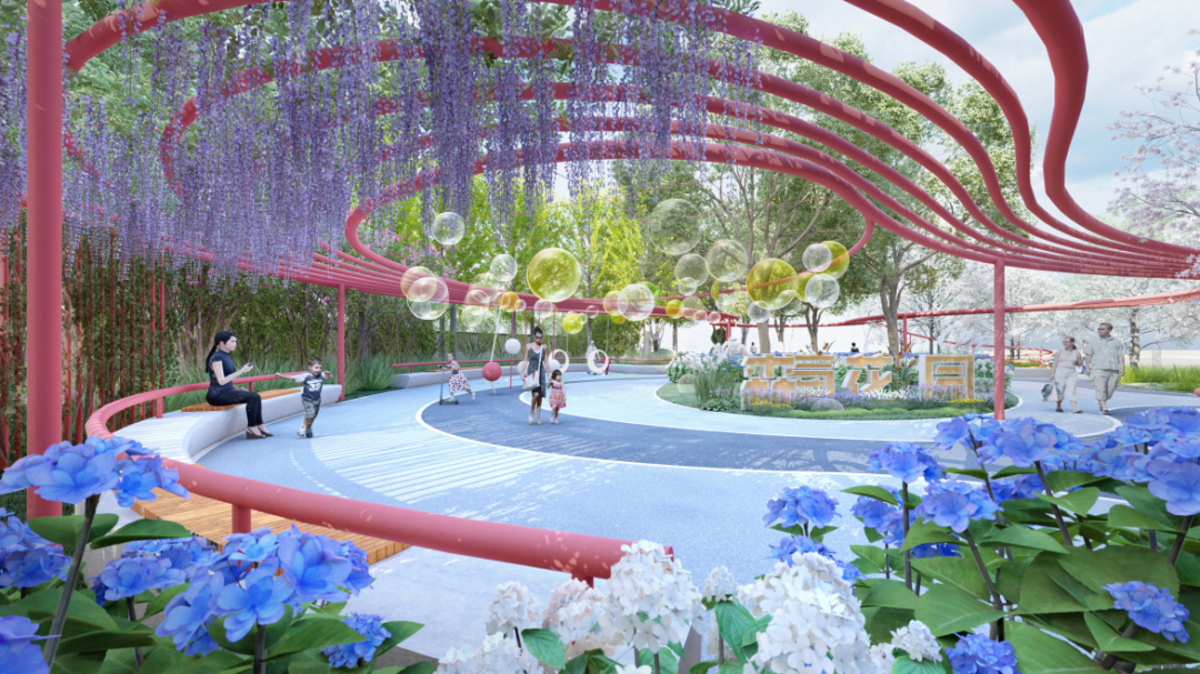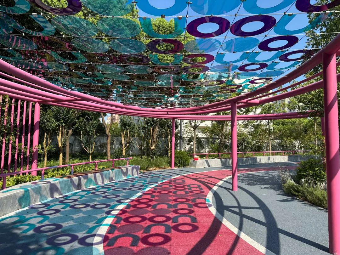 上海,因水成陆、因水聚人、因水立业。浦江镇不仅名字内含水的寓意,其精神谱系也与水密不可分。森氧花园的设计融入了流动的水形,头顶廊架设计让人仿佛置身于波光粼粼中。这里还巧妙利用色彩间的明暗、冷暖等关系,铺设彩色沥青地面,为居民提供具有丰富色彩的休息环境。此外,公园内布置了较多的休憩空间, 也成为居民 休息、交谈、观赏的小天地