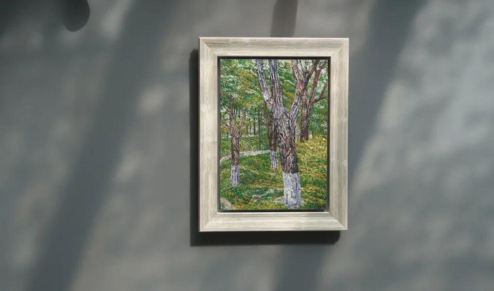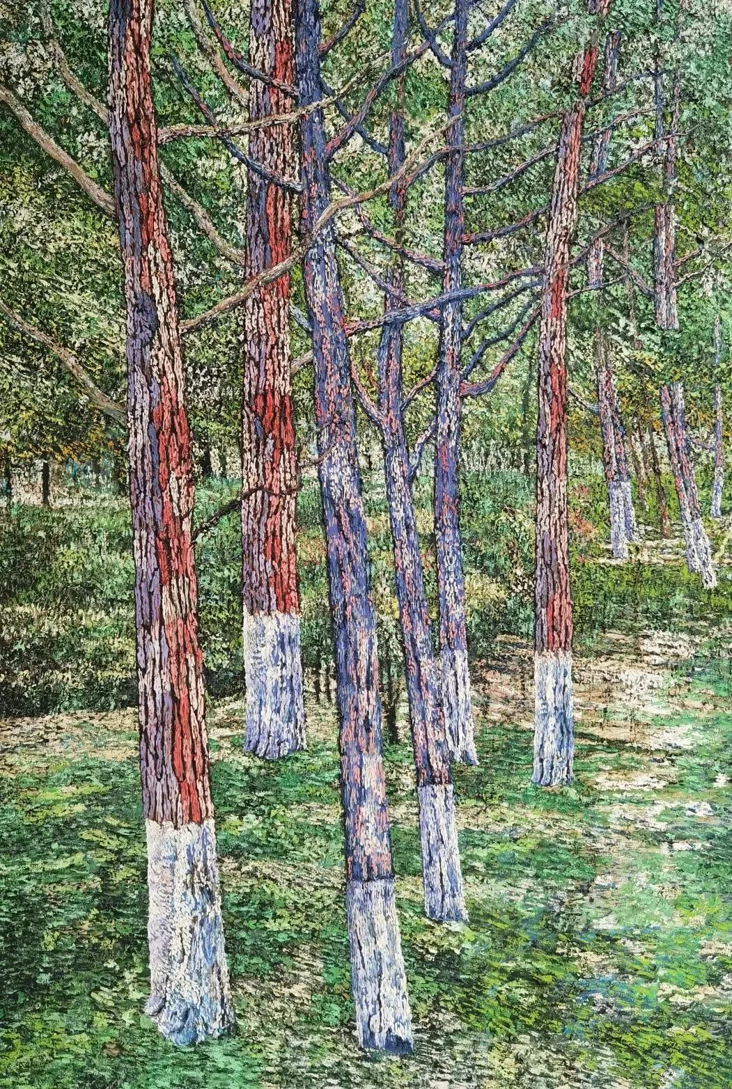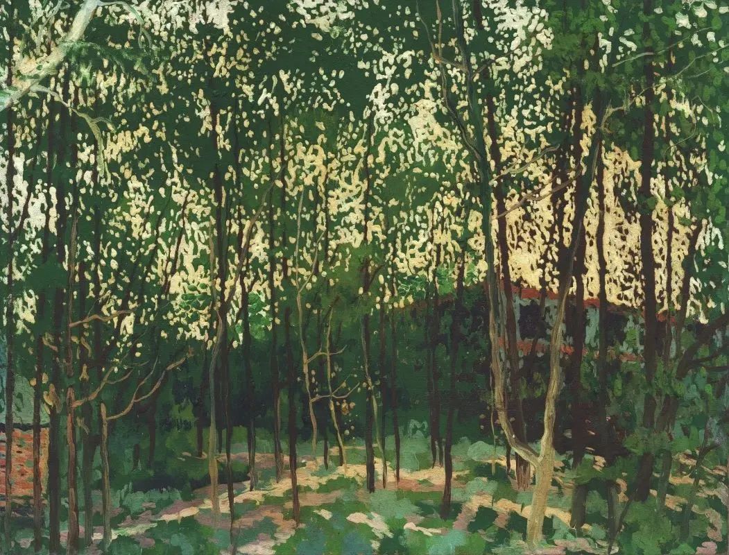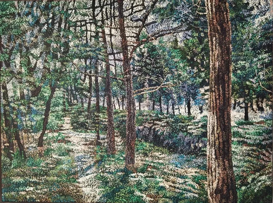 他喜欢画家乡的风景,喜欢画树林,也喜欢将自己看到的加上想象构思成画面。“树林”这一主题从年少学画初始伴随谢山至今,他不厌其烦地画着树林,山野丛林、路边树丛、繁茂的树叶、抽象的色块……