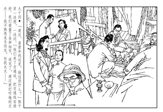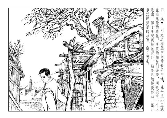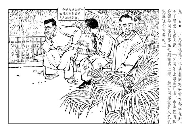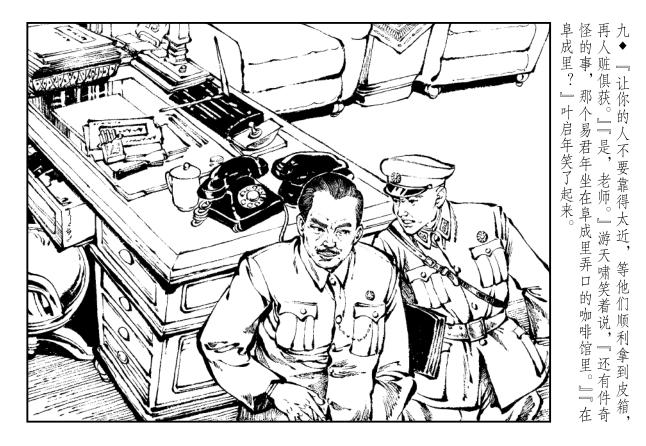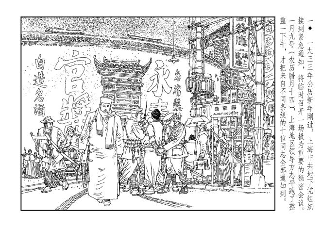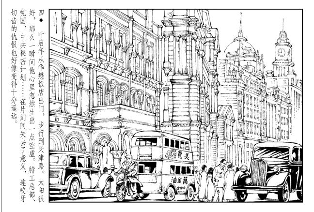 《千里江山图》连环画分为《风起云涌》《千里追踪》《决战浦江》三册,由50后桑麟康、60后满振江、70后倪春培三代画家联合绘制。三位画家确定了三条创作原则:首先是传统单线白描加小黑墨块;其次是生活化地确定人物造型,提高人物辨识度,避免脸谱化;三是注重生活场景,服装、道具、街面广告都要有上世纪30年代的特征。他们根据小说提供的线索到故事发生地走走看看,借助图书馆、互联网,了解当时马路上的机动车、空中的电线走向,收集1933年马路广告图片信息,每一处细节都不马虎。
