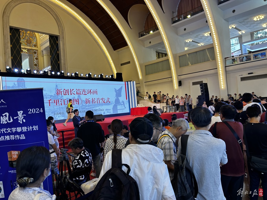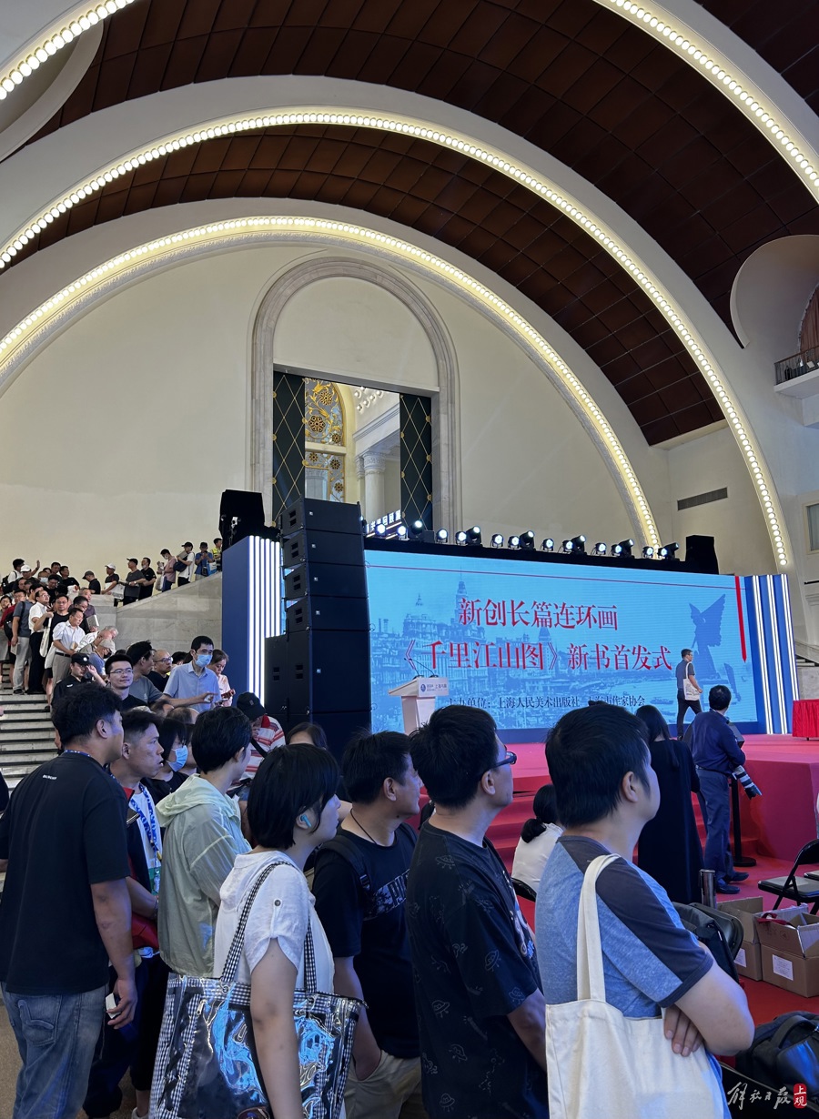 8月17日上午,根据茅盾文学奖同名获奖小说改编的新创长篇连环画《千里江山图》在上海书展首发,中央大厅活动区被长长的读者队伍包围,两侧大扶梯的人流接上了龙,热火朝天的情景让原著作者孙甘露都直呼:“惊呆了。”