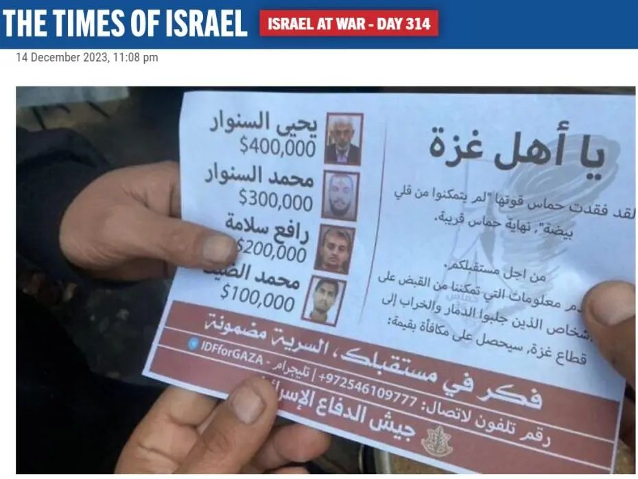 以方悬赏缉拿辛瓦尔的传单。图/《以色列时报》网站截图