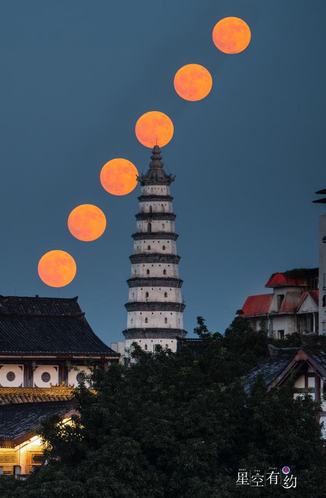 这是8月19日晚在重庆文峰古街拍摄的“超级月亮”(多张叠加)。(星空摄影师郑杰 摄)