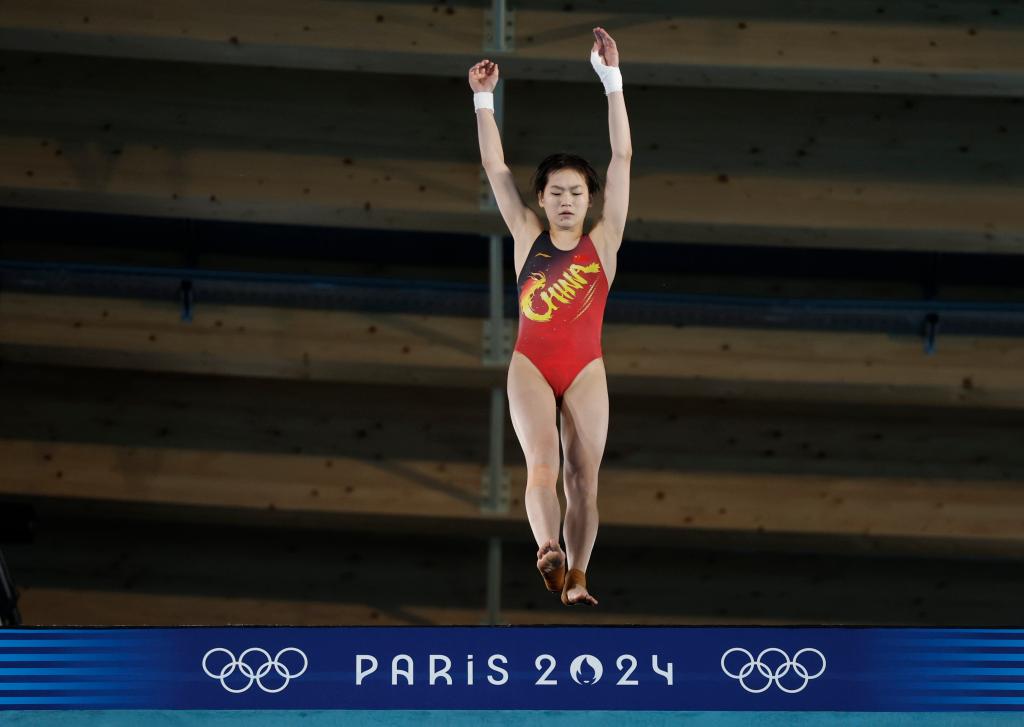 ??↑8月5日,中国选手全红婵在巴黎奥运会跳水女子10米台半决赛中。新华社记者张玉薇摄