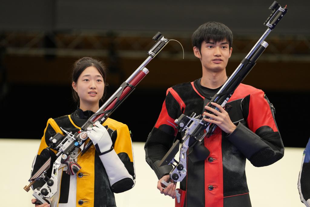 ??↑7月27日,中国选手黄雨婷/盛李豪(右)在赢得巴黎奥运会首枚金牌后。新华社记者鞠焕宗摄
