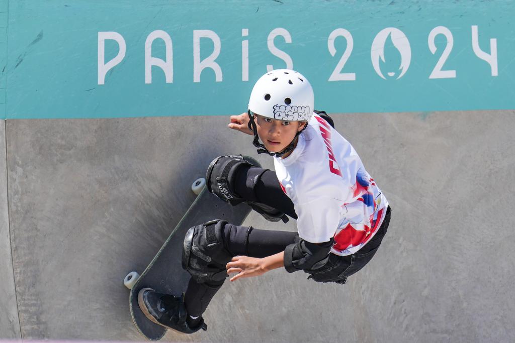 ??↑8月6日,中国选手郑好好在巴黎奥运会滑板女子碗池预赛中。新华社记者杜宇摄