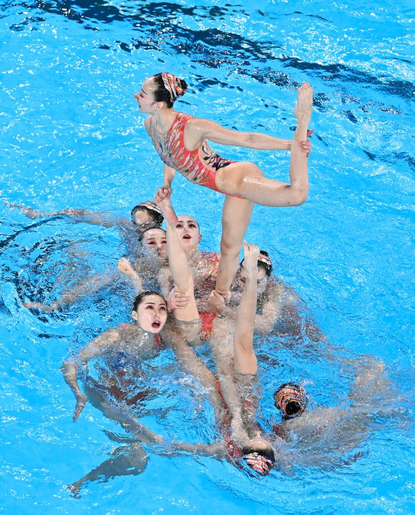 ??↑8月7日,中国队在巴黎奥运会花样游泳集体技巧自选比赛中。新华社记者夏一方摄