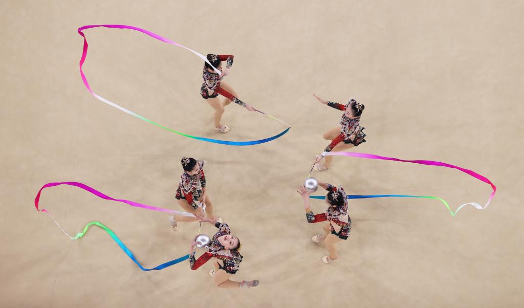 ??↑8月10日,中国队在巴黎奥运会艺术体操项目集体全能决赛中。新华社记者郭昱摄