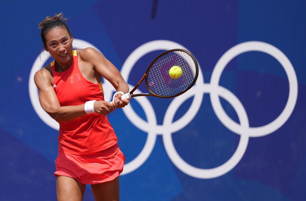 ??↑7月30日,郑钦文在巴黎奥运会网球女子单打第三轮比赛中回球。新华社记者万象摄