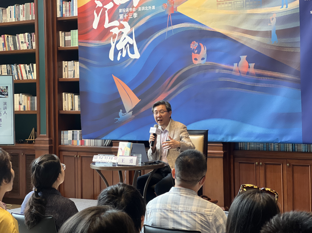 在位于北外滩的建投书局·浦江店,读者们通过线上报名方式来到了位于4楼的传记图书馆,听茅盾文学奖得主王旭烽分享自己创作《西湖十景》这一中篇小说系列时的心路历程,与上海音乐家协会副主席、上海大学音乐学院院长、教授王勇一起,共同追溯中国流行音乐的起源,探讨上海老歌如何在中西方元素的共同滋养下生根发芽↓