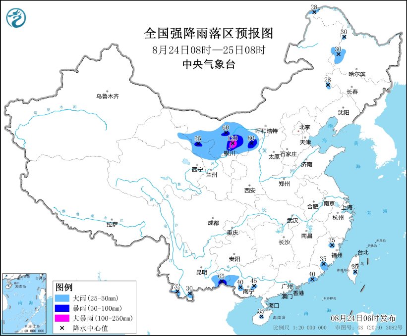 预计,8月24日08时至25日08时,内蒙古西部、甘肃中部、宁夏、陕西北部、黑龙江西部、内蒙古东部、吉林西部,以及云南南部、广西西部和南部、福建东部等地部分地区有大到暴雨,其中,内蒙古河套地区、宁夏中北部等地部分地区有大暴雨(100~120毫米)。上述部分地区伴有短时强降水(最大小时降雨量20~50毫米,局地可超过70毫米),局地有雷暴大风等强对流天气。中央气象台8月24日06时发布暴雨蓝色预警。