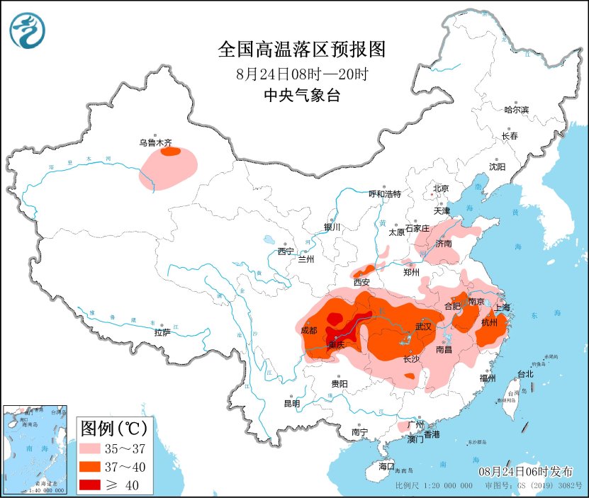 预计8月24日白天,四川盆地、重庆、湖北、湖南、安徽中南部、江苏中南部、上海大部、浙江、江西、福建西北部、贵州北部、云南东北部以及新疆南疆盆地东部、陕西中南部、山西南部、河北南部、山东北部和西部、河南北部和南部等地有35℃以上高温天气,其中,四川盆地东部、重庆、陕西南部、湖北大部、湖南北部、安徽南部、浙江中部以及新疆吐鲁番盆地等地部分地区最高气温37~39℃,局地可达40℃以上。中央气象台8月24日06时继续发布高温黄色预警。