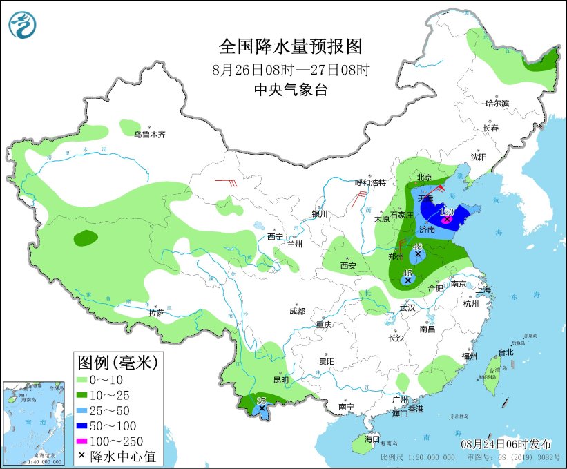 8月26日08时至27日08时,天津、河北东部、山东大部、河南东部和南部、安徽北部、云南南部等地部分地区有大到暴雨,其中,山东中部等地部分地区有大暴雨(100~120毫米)。甘肃河西、陕西北部、河北南部、河南中部等地部分地区有4~6级风。