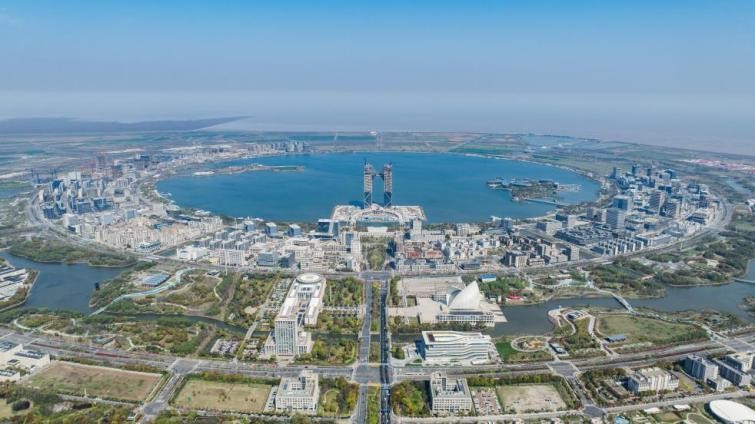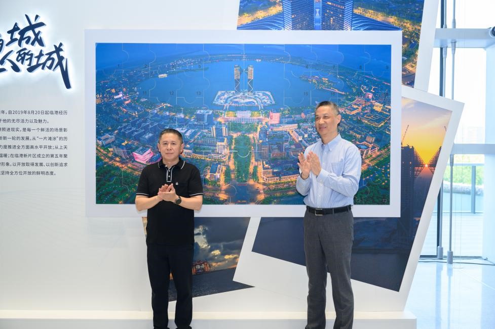 临港新片区党工委委员、管委会专职副主任苗挺,临港投控集团党委书记、董事长、总经理张继志共同拼接象征临港五周年发展的滴水湖景,揭幕大展。