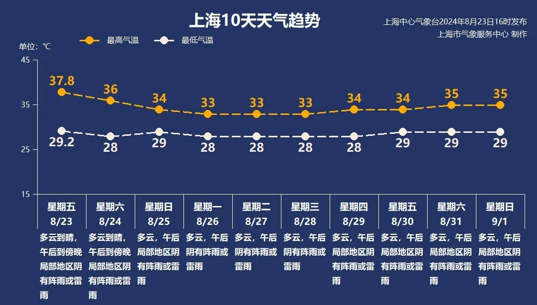 上海受副热带高压控制,今天多云到晴,午后到傍晚局部地区阴有阵雨或雷雨,最低气温28℃,最高气温36~37℃,偏东风3~4级,雷雨时阵风7-9级,风向偏北。相对湿度90%~50%。
