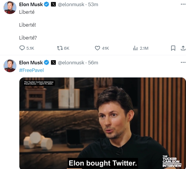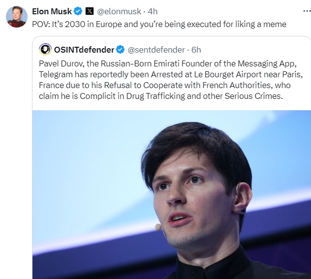 社媒“电报”创始人在法国被捕,马斯克连发三遍“自由”要求释放杜罗夫