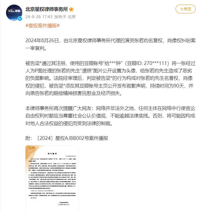 搜狐娱乐讯 8月27日,张若昀方律师发布案件播报,演员张若昀名誉权、肖像权纠纷案一审宣判。被告梁*通过其注册、使用的豆瓣账号“给***钟”(豆瓣ID:270***111)将一张经过人为P图处理的张若昀先生“遗照”图片公开设置为头像,给张若昀先生造成了恶劣的负面影响。法院经审理后,判定被告梁*的行为构成对张若昀先生名誉权、肖像权的侵犯,被告梁*须在其豆瓣账号主页公开发布致歉声明,持续时间为90天,并向原告张若昀赔偿精神损害抚慰金及经济损失。