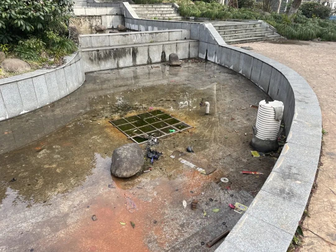 在多年的风吹日晒下,部分景观设施开始老旧破损,这个水池也慢慢荒废了。