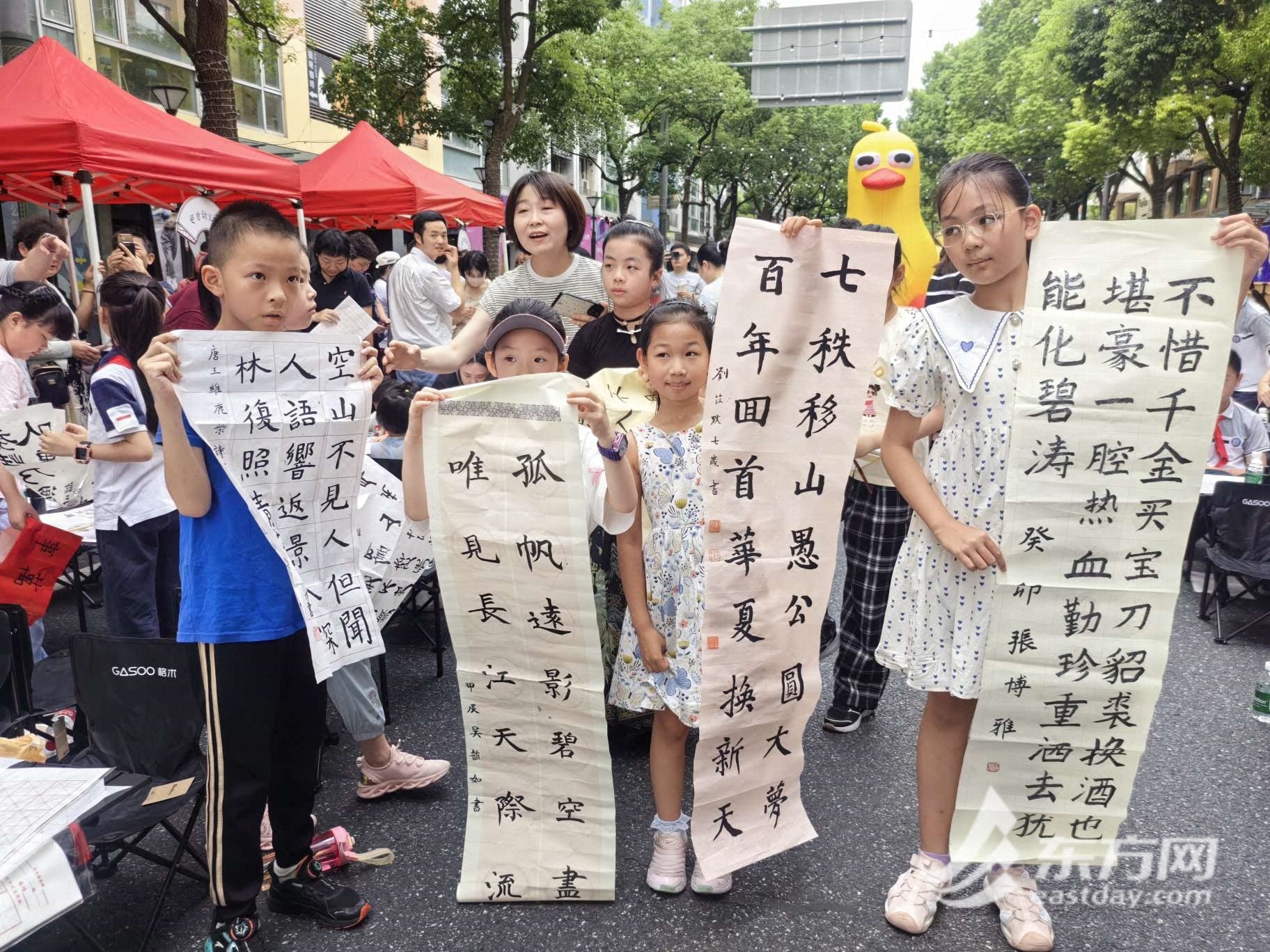 来自复旦二附校的陈禹铭正在用小篆写他的名字。他讲得头头是道,“楷书讲究顿笔,是尖头的,小篆是圆头的,我喜欢写小篆”,陈禹铭马上小升初了,他告诉记者,除了书法,自己还参加了硬笔、国画、国学、羽毛球、乒乓球等兴趣班。“其中最喜欢国画和书法,我国画已经考到九级了”,陈禹铭说,从小就对传统文化很感兴趣,这样的开笔节也让他大开眼界。