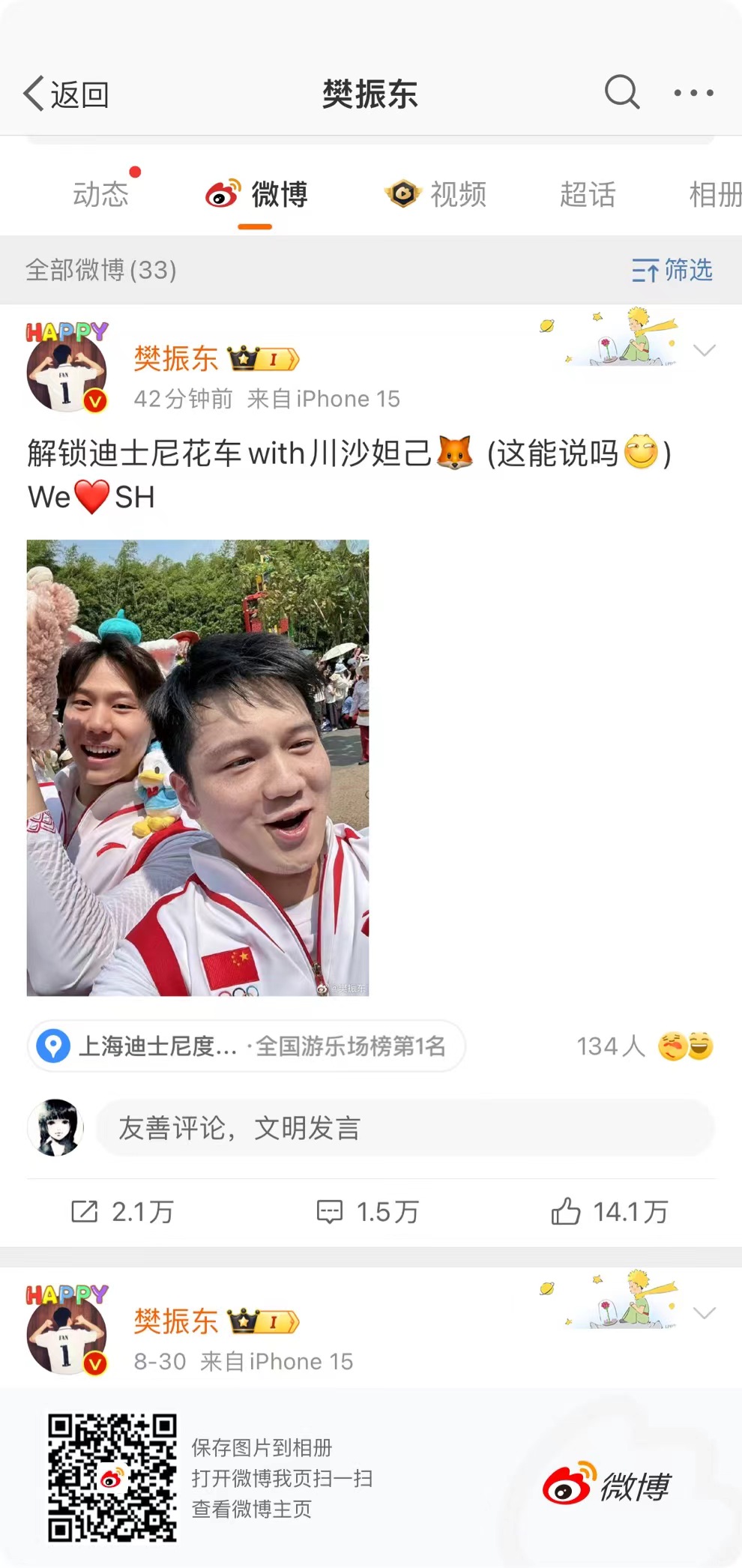 “解锁迪士尼花车with川沙妲己。”9月7日14时许,巴黎奥运乒乓球冠军樊振东在微博晒出自己与奥运游泳冠军覃海洋在上海迪士尼乐园的合影。