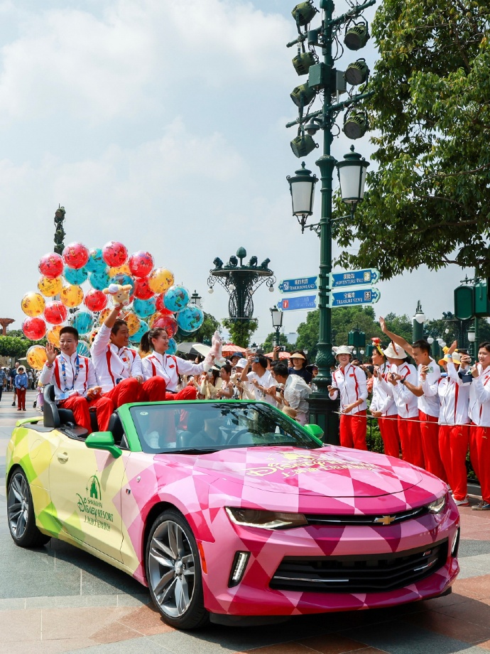 中午时分,樊振东、覃海洋、吴愉、郭崎琪和张之臻受邀担任了“米奇童话专列”的“荣誉领航”,在巡游道路两旁游客们的欢呼声中前行。