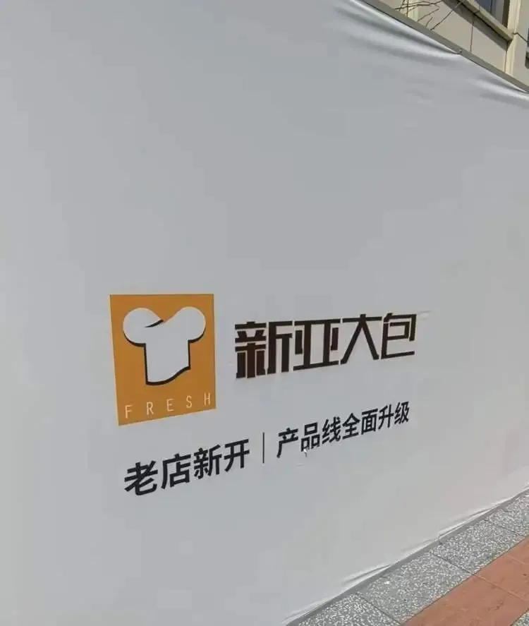 最近,该店外围已立起装修围挡,而在围挡之上,贴了新告示:“老店新开,产品线全面升级。”上面还有新亚大包的品牌名,和熟悉的那顶白色厨师帽LOGO。