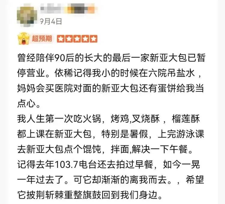 然而,5月、6月、7月、8月……整个超级炎热的夏天都过去了,新亚大包还是没有开门,这也让网上传言纷纷:新亚大包最后一家门店关门了!网站上,有不少老客唏嘘留言。一方面,大家认为老牌的新亚大包面对如今激烈的餐饮竞争,没落下来不算奇怪;另一方面,大家出于怀旧的心理,并不希望这个寄托了无数人美好回忆的牌子真的消失;除此之外,还有人表示,自己的充值卡还没用完。