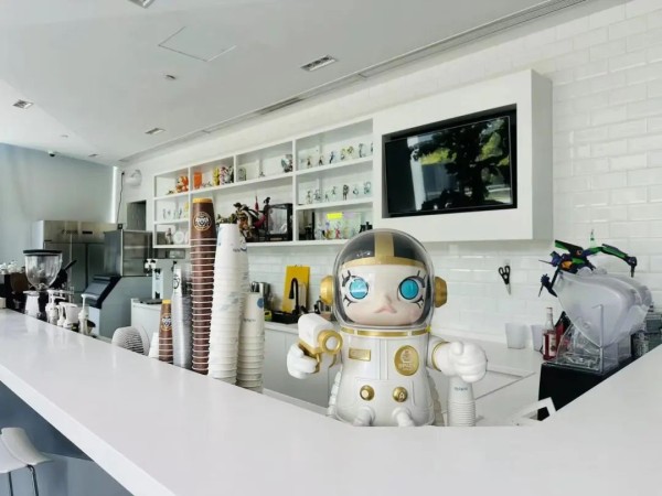 一楼空间还有咖啡区,虽然不对外营业,但是吧台上同样摆满了角色立牌、手办等,满满的二次元风。
