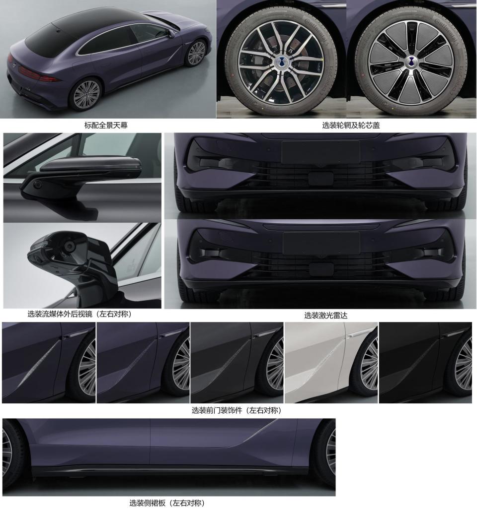 动力方面,提供纯电和插混两种版本,本次申报的是纯电车型,搭载三电机,最大功率分别为230/240/240kW,电机总功率710kW。插混车型电机总功率640kW,2.0T涡轮增压发动机提供207马力(152kW)的最大功率,最高时速分别为240km/h和230km/h。插混车型最高续航1100km,纯电四驱续航为630km。