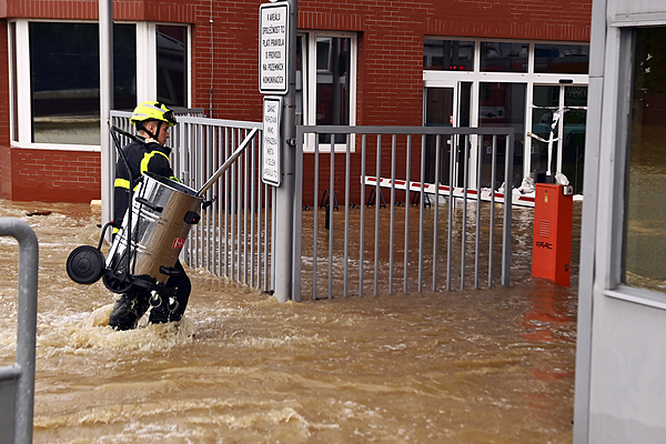 当地时间9月15日,捷克奥帕瓦,消防员在洪水中行走 视觉中国