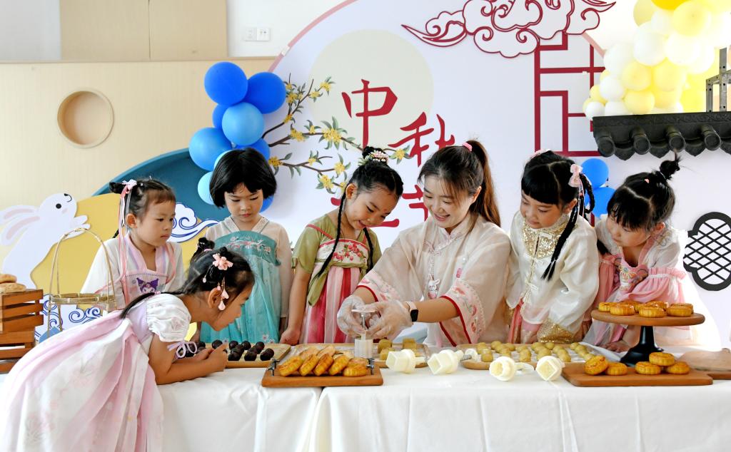 9月12日,浙江省台州市仙居县迎晖幼儿园小朋友在老师的指导下学做手工月饼。新华社发(王华斌摄)