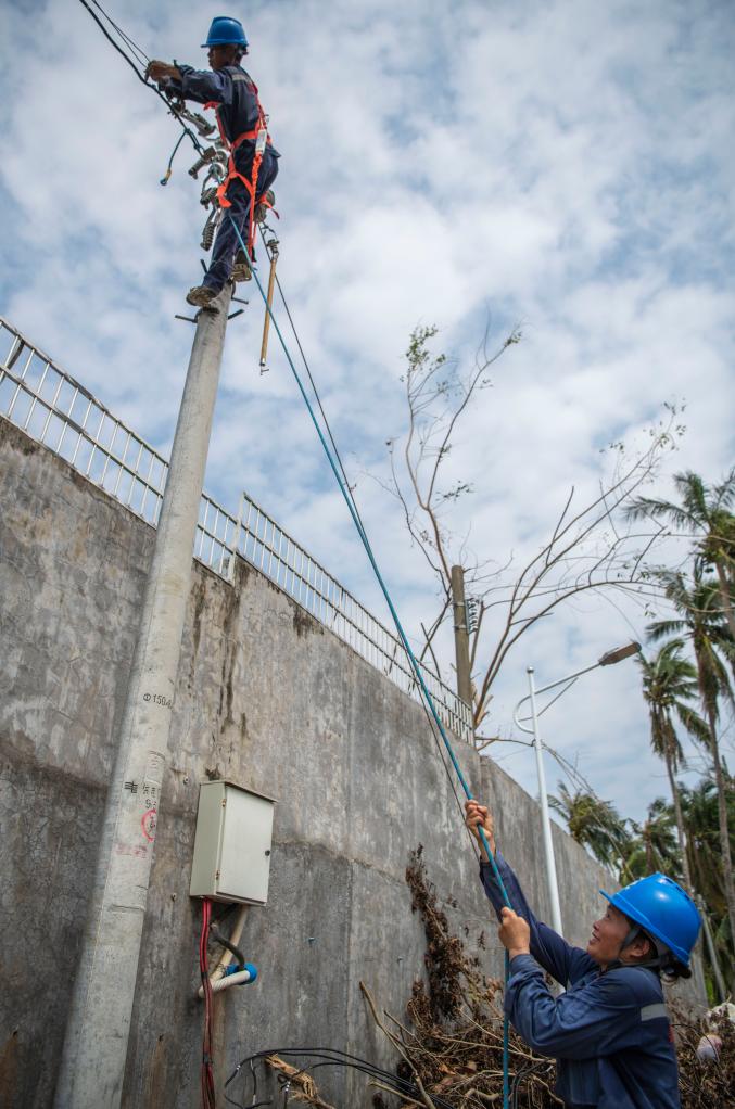 9月15日,海南省文昌市清澜镇,电力工人抢修台风损毁的供电线路。新华社发(蒙钟德摄)