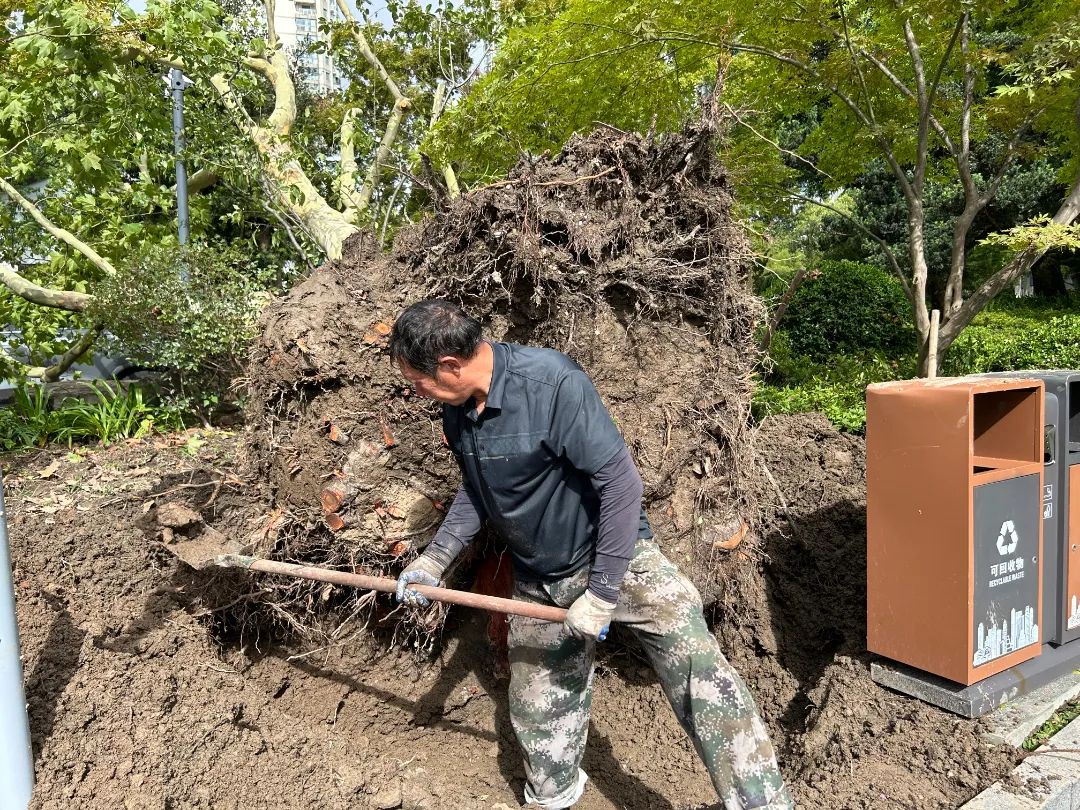 ▲大型树木倒伏,工人在树根处挖掘深坑,为后续大型吊车扶正做准备