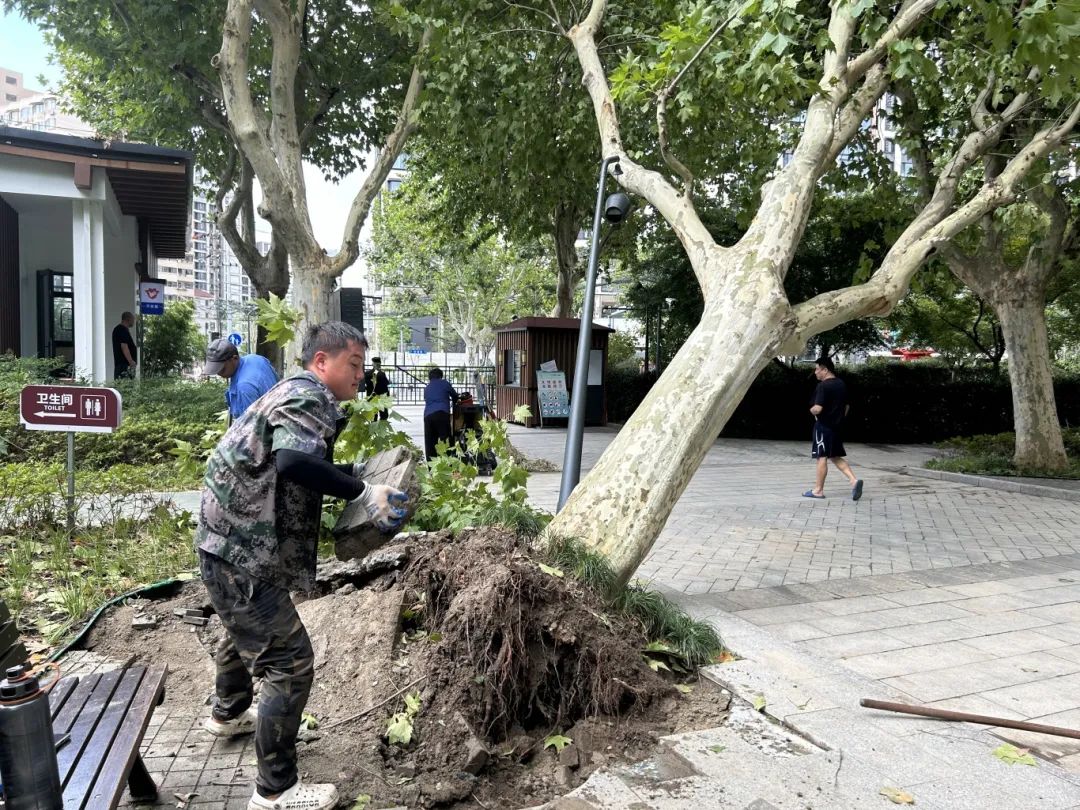 公园2号门入口处,一株庞大的悬铃木倒伏。工人们正手持铁铲,在树根周围挖掘深坑,为后续大型吊车扶正树木做准备。和平公园管理人员告诉记者,针对大型树木倒伏,除扶正外,还需进行回缩修剪、伤口消毒等处理,以提升树木的存活率,确保其重焕生机。