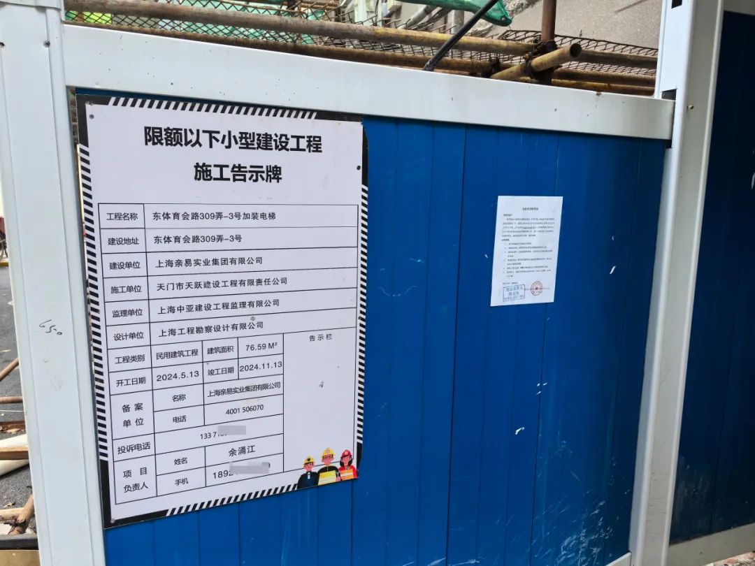 抬脚跨入脚手架内部,这才看到:1个水泥砌起来的方坑,加上3根竖起来的2层楼高的钢架,便是3号楼电梯的“全貌”。方坑里积满了雨水,滋养的蚊子叮了记者一腿。脚手架一侧,悬挂了一块“施工告示牌”,显示3号楼的加梯工程今年5月13日才开工,竣工日期为今年11月13日,由“上海亲易实业集团有限公司”负责建设。乍看告示牌上的信息,3号楼的加梯工程不只是略有拖延吗?“这是假信息”,居民们吐露实情:原来,3号楼和4号楼竟差不多同时启动加梯项目,均为2021年底就已签订加梯合同,也都是由“轻易实业”负责代建。