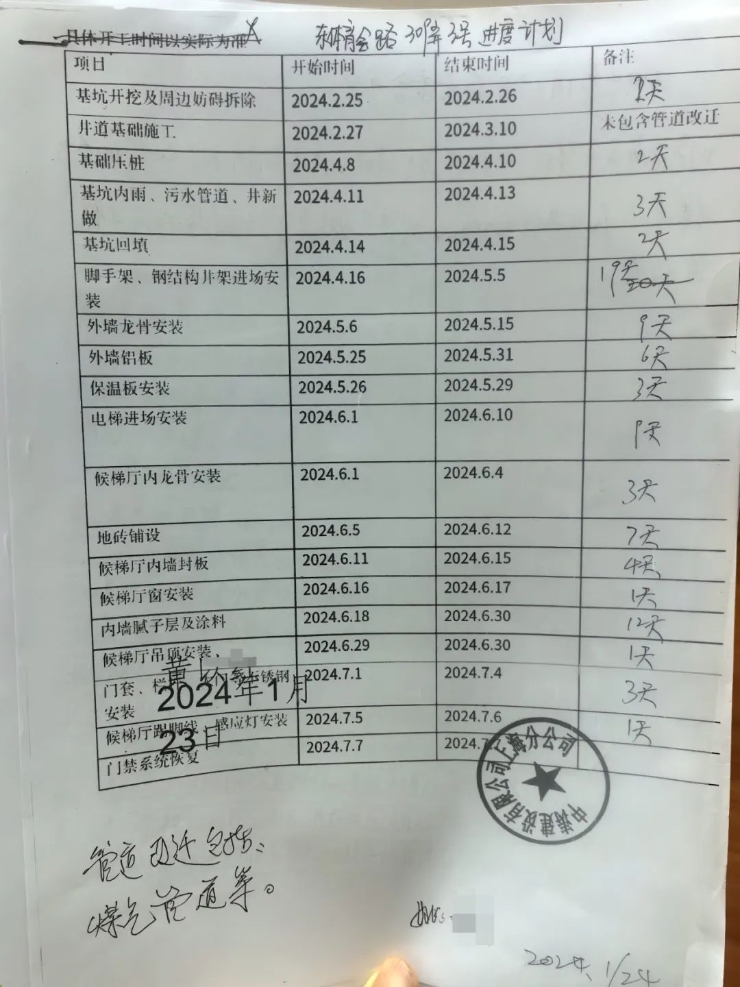 △图为今年年初,在属地居委会的协调下,代建方和施工方拿出的“进度计划”,承诺将于今年2月25日开工,7月7日让居民坐上电梯。