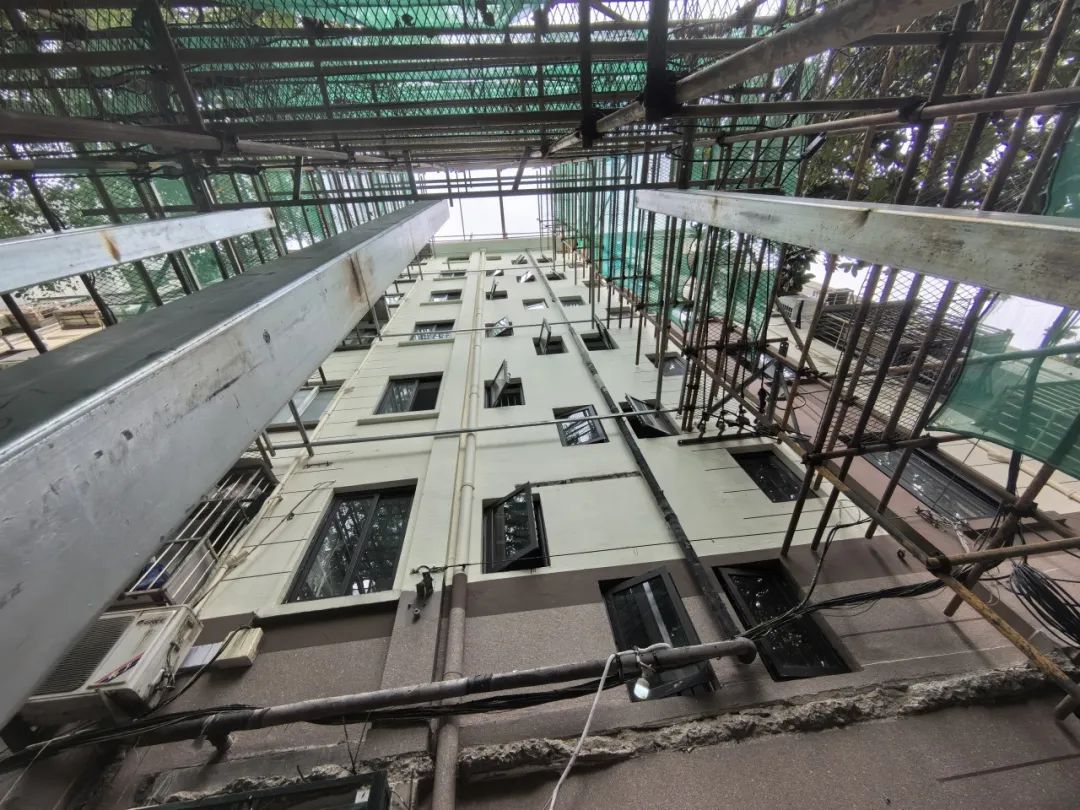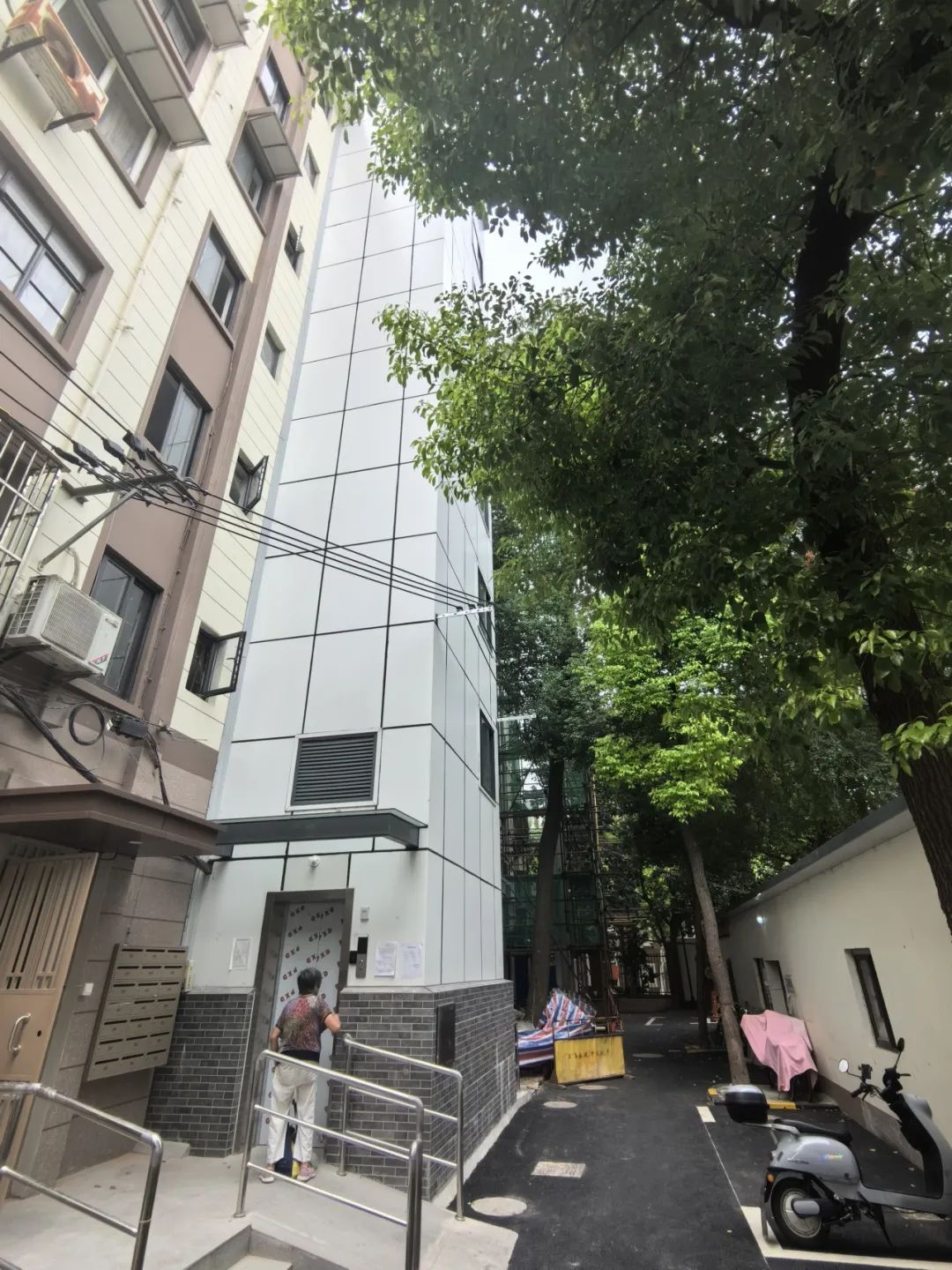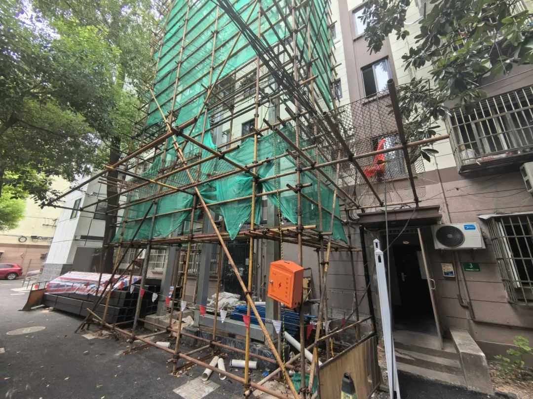 △图上近处是已经正常启用的4号楼加装的电梯,远处3号楼外侧只能看到林立的脚手架。 本文图均为 上海民声直通车微信公众号 图