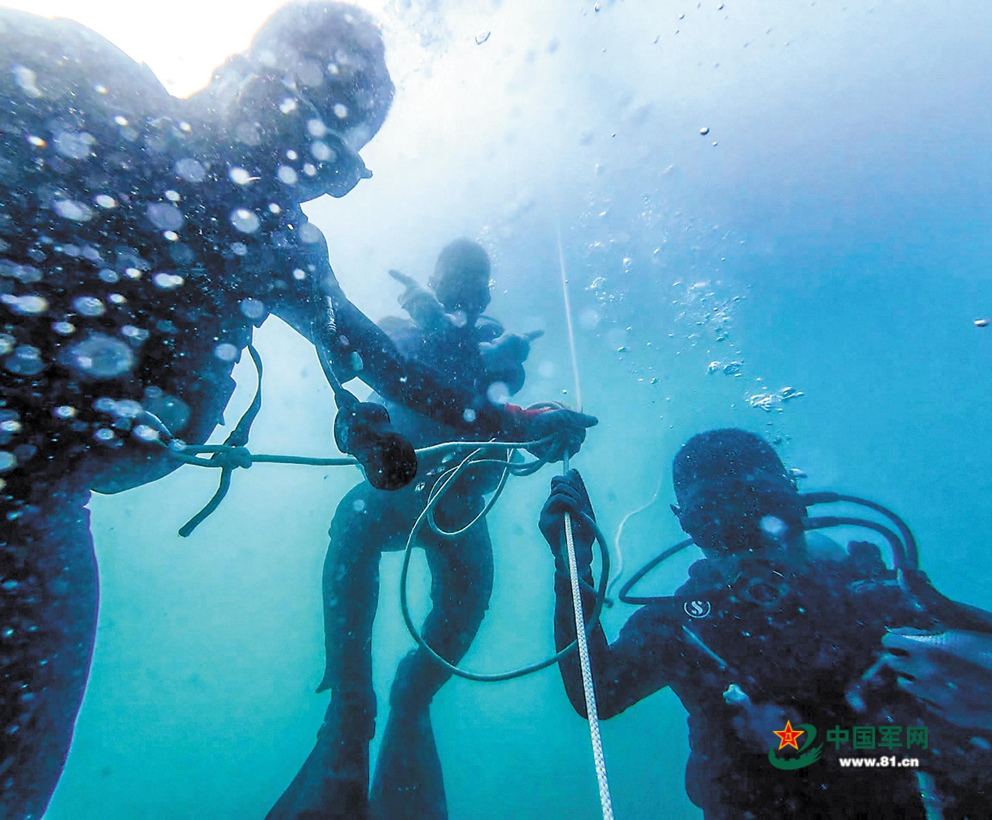 “蛙人出击!”舰艇抵达雷区附近,反水雷蛙人携带灭雷装具潜入深海,仔细摸排目标。在扫雷舰的配合下,多枚水雷被成功清除。随后,一艘艘战舰在扫雷舰引导下顺利出港。