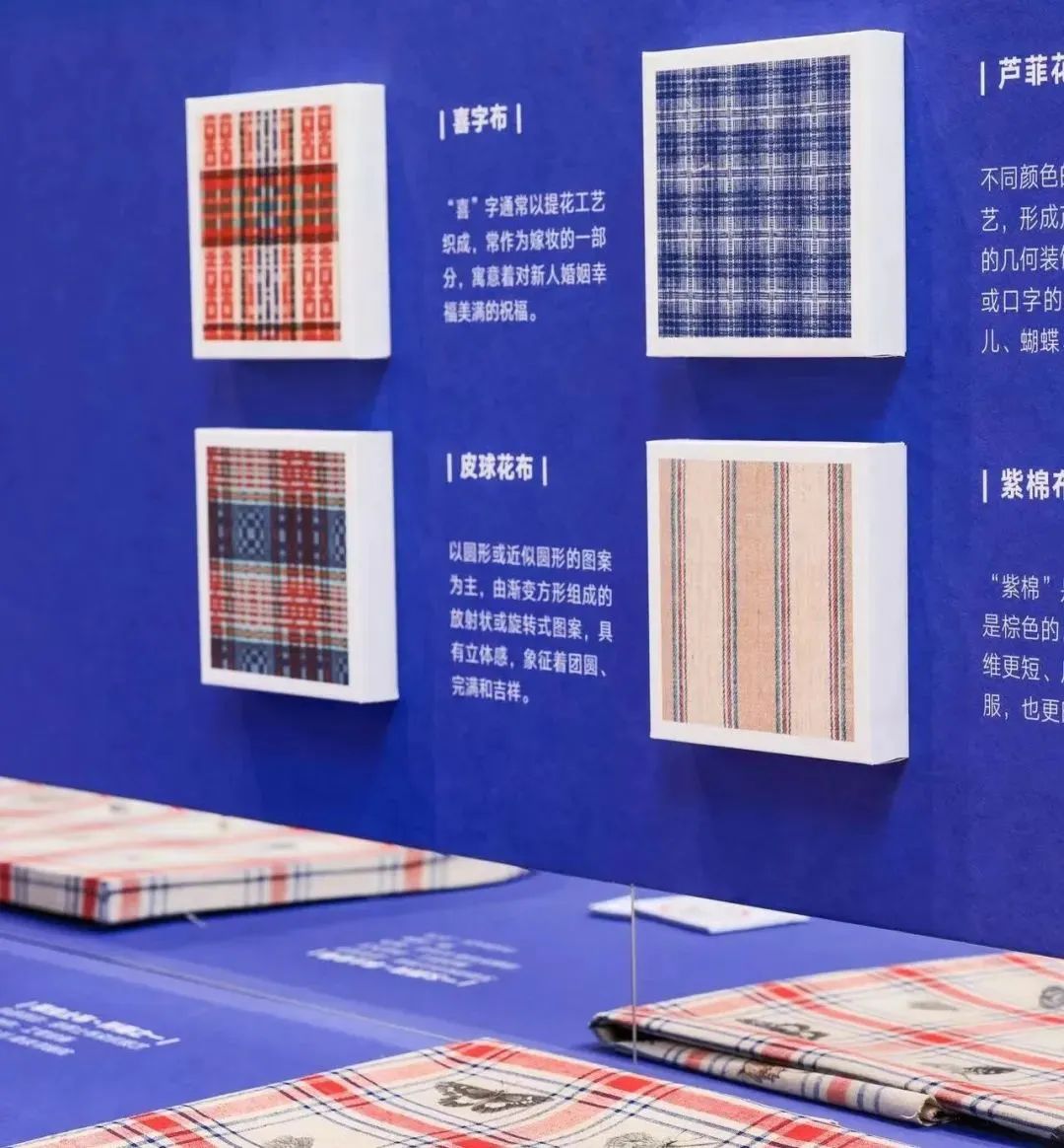 崇明土布源于元末明初,是一种以平纹组织形式为主的棉纺织物,质朴、厚重,兼备保暖和透气功能,是寻常百姓家最常见的布料。一块土布从棉花开始,需要经过轧、弹、擀、纺、染、经纱等十多道工序后,最后才能上机编织。崇明土布大部分以蓝色调为主,配色雅致,经纬从横交织出各式各样图案,主要有芦扉花、井字纹、秤星布、喜字纹等。