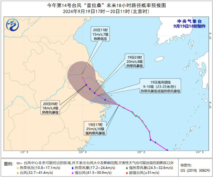 今年第14号台风“普拉桑”(强热带风暴级)的中心已于今天(19日)傍晚6点50分前后在浙江省舟山市岱山县沿海登陆,登陆时中心附近最大风力10级(25米/秒),中心最低气压为990百帕。