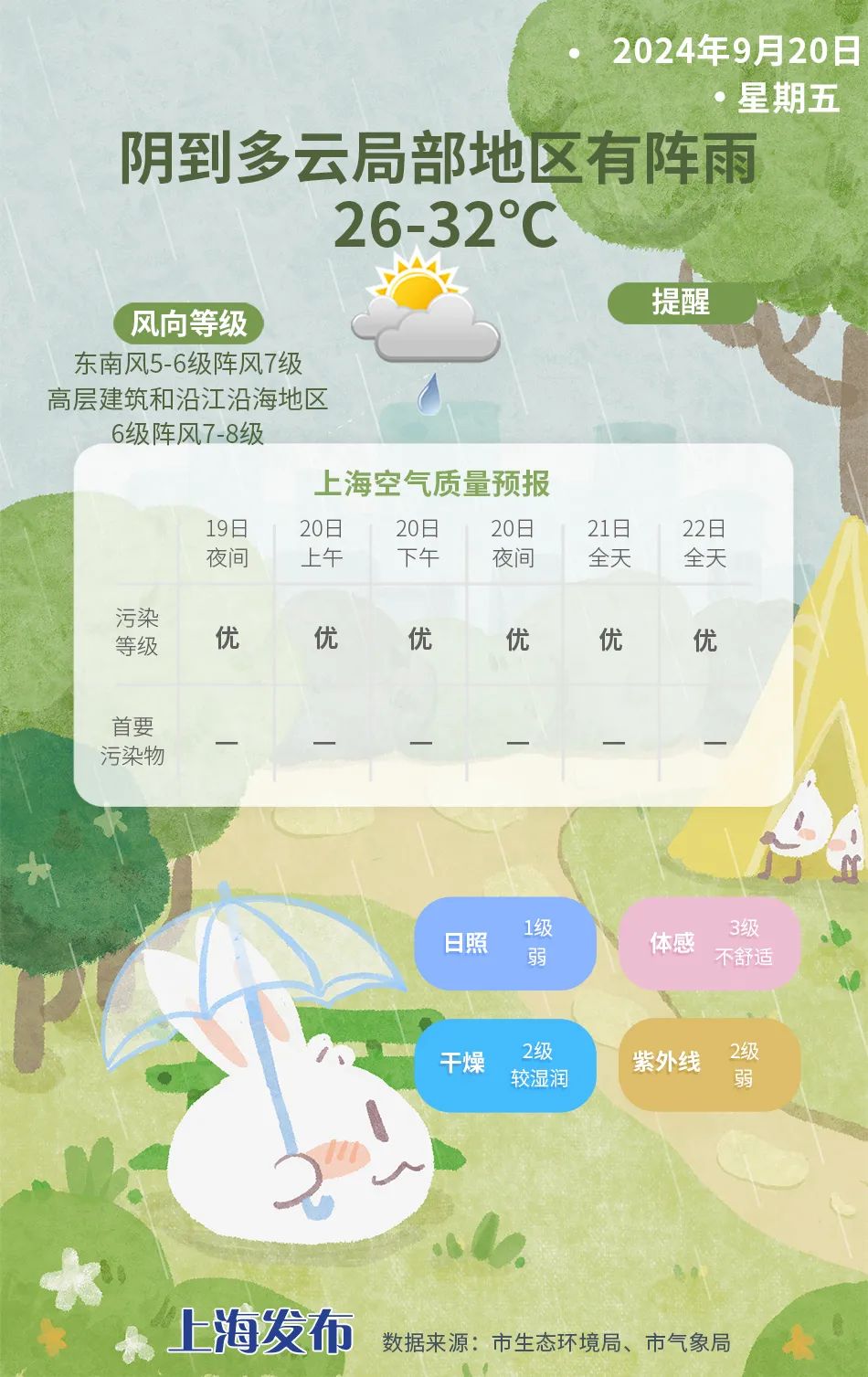 明天白天上海的风雨逐渐减弱,以阴到多云天气为主,局部地区有些短时阵雨。东南风5-6级,阵风7级。气温在26-32度之间。由于气压低、湿度大,体感有些潮湿闷热。