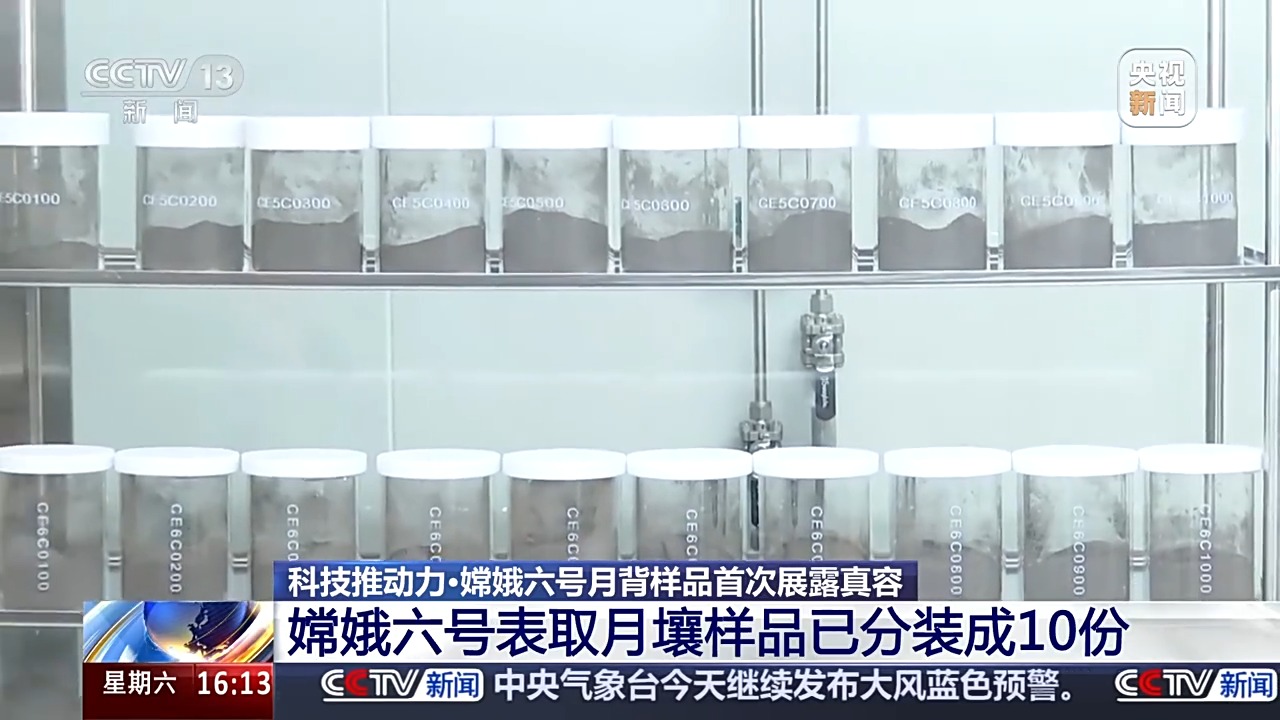 总台央视记者帅俊全:在我身边的月球样品存储柜当中可以看到,下面这一层就是嫦娥六号的表取样品,现在已经被分装到了10个玻璃器皿当中,每一个大概是150克。