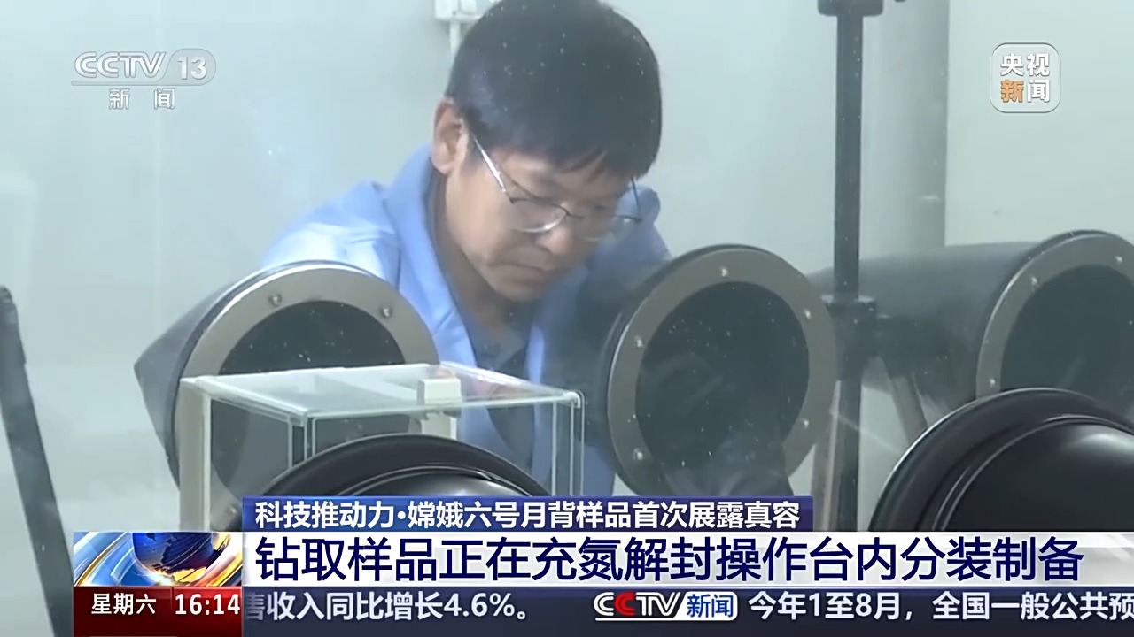 相对于表取样品而言,钻取样品的分装工作难度更大,预计还需要一两个月。记者看到,科研人员正在充氮解封操作台内对嫦娥六号的钻取样品进行处理。