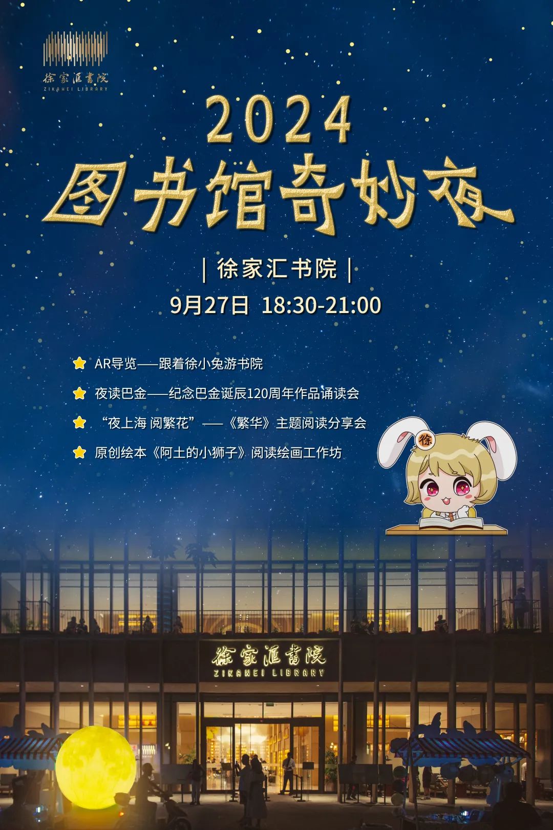 活动内容:徐汇区图书馆2024年“阅见未来——图书馆奇妙夜”体验活动,聚焦海派文化之源区域特色,发挥徐家汇书院“光源”效应,文化与旅游的深度融合,结合AR导览服务技术,市民游客可以跟随徐小兔的介绍夜探书院八景,还将开展原创双语绘本《阿土的小狮子》阅读绘画工作坊、夜读巴金——纪念巴金诞辰120周年作品诵读会、“夜上海阅繁花”——《繁华》主题阅读分享会等特色活动,打造夜间文化盛宴,展示中西文化互见交流生动图景,助力夜间经济发展,共享卓越城区美好生活。