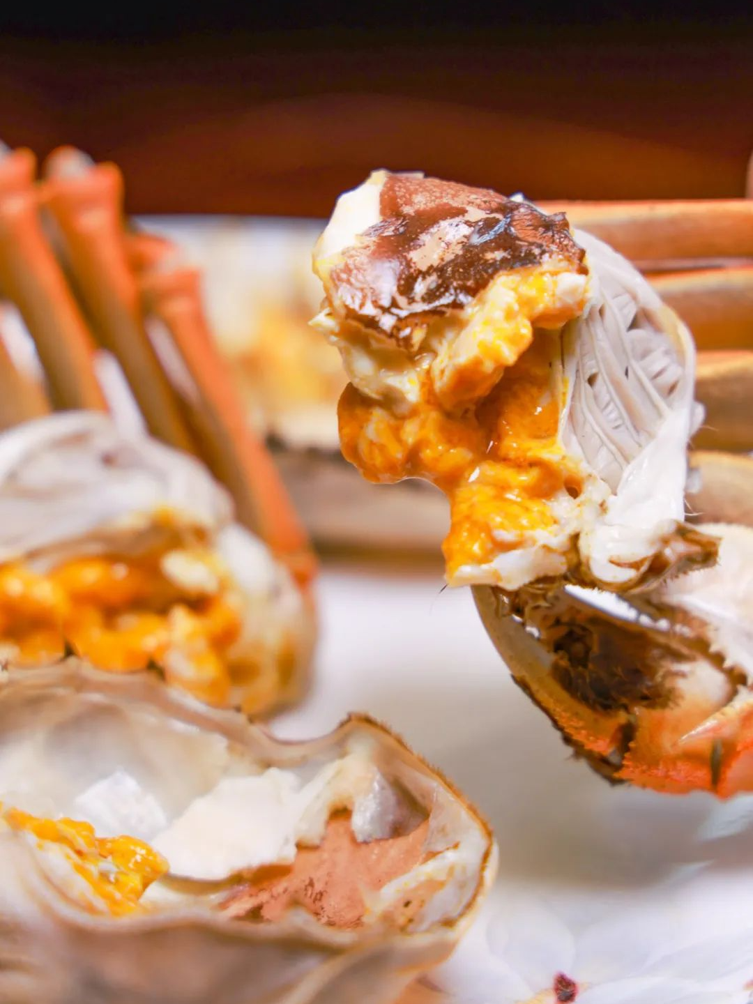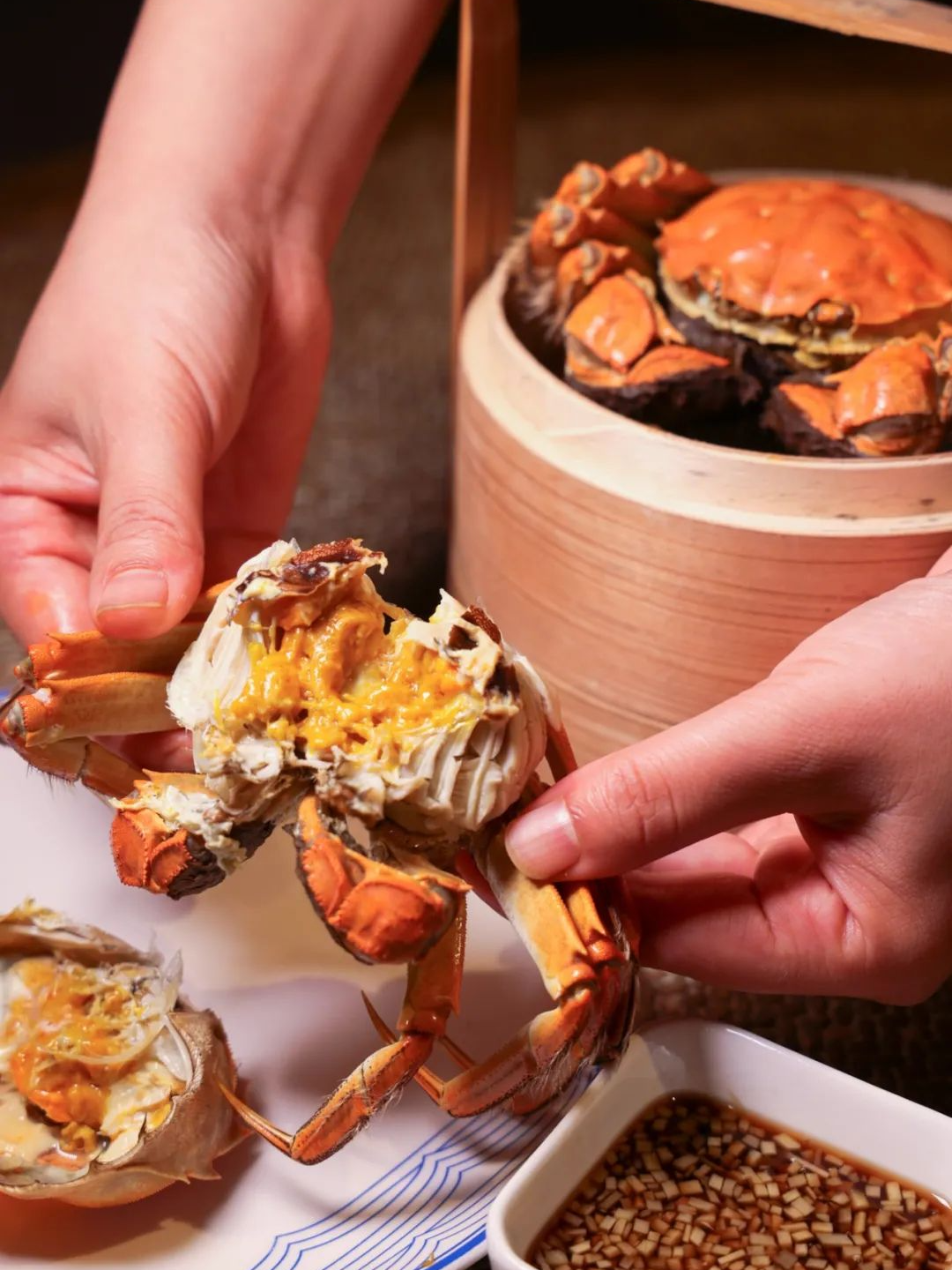 蒸好的大闸蟹蟹黄、蟹膏饱满,蟹肉细腻而甘甜,趁热边剥边吃,无需蘸取任何佐料就能感悟到“蟹肉上席百味淡”的真谛。