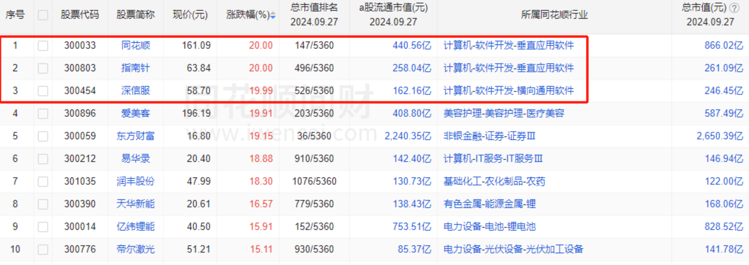 具体到100只个股中,近4成个股涨超10%。涨幅前三名均为计算机软件开发行业,其中,同花顺、指南针领涨,涨幅达20%,深信服位居其后,涨幅19.99%。权重股中东方财富涨幅19.08%,迈瑞医疗涨幅10.76%,宁德时代涨幅逼近10%。