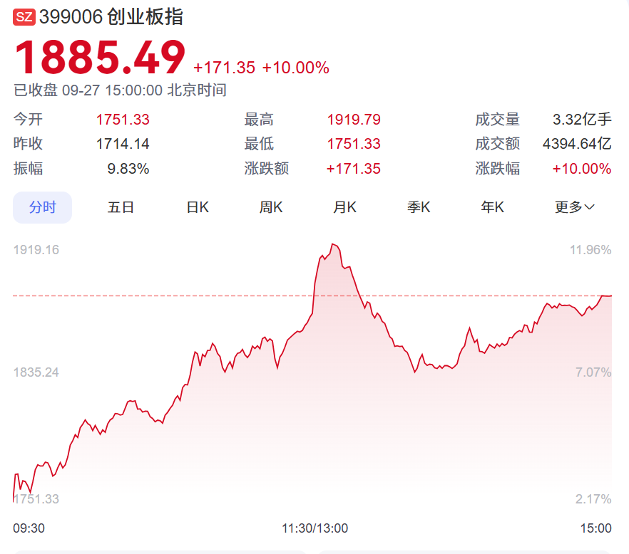 9月27日,创业板指午后快速拉升涨幅扩大至11%,今日盘中最高涨幅为11.96%,截至收盘,创业板指报1885.49点,涨幅10%,成交额突破4000亿元。