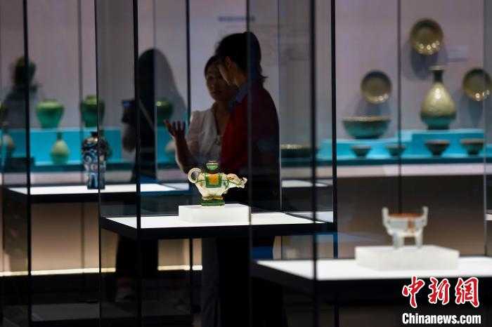 9月27日,海南琼海,展出的明代《珐华贴金镂空孔雀牡丹纹大罐》吸引参观者。当日,“深蓝宝藏——南海西北陆坡一二号沉船考古成果特展”在中国(海南)南海博物馆开展。本次展览是南海海域深海考古调查的成果专题展。在深海1500多米处沉睡了500多年的出水文物首次公开亮相。展览展出上述两处明代中期沉船遗址出水的文物408件(套),还有故宫博物院等借展文物34件/套,共计展出442件(套)。中新社记者 骆云飞 摄