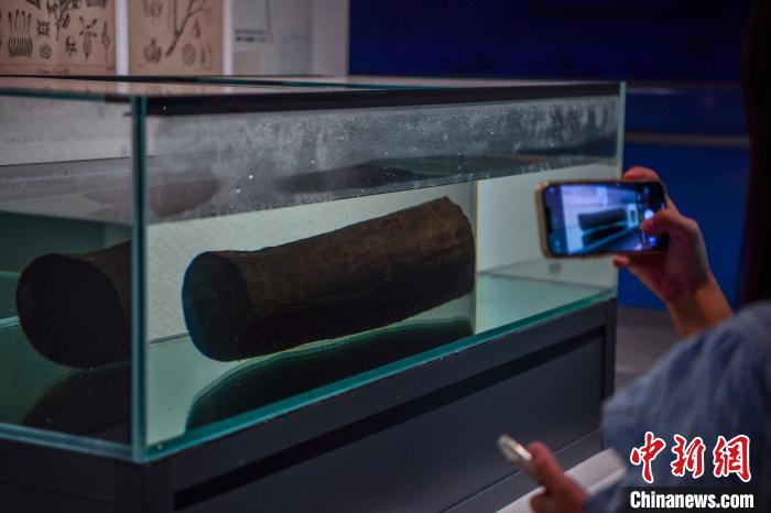 9月27日,海南琼海,展出的南海西北陆坡二号沉船遗址出水乌木原木吸引参观者拍照。当日,“深蓝宝藏——南海西北陆坡一二号沉船考古成果特展”在中国(海南)南海博物馆开展。本次展览是南海海域深海考古调查的成果专题展。在深海1500多米处沉睡了500多年的出水文物首次公开亮相。展览展出上述两处明代中期沉船遗址出水的文物408件(套),还有故宫博物院等借展文物34件/套,共计展出442件(套)。中新社记者 骆云飞 摄
